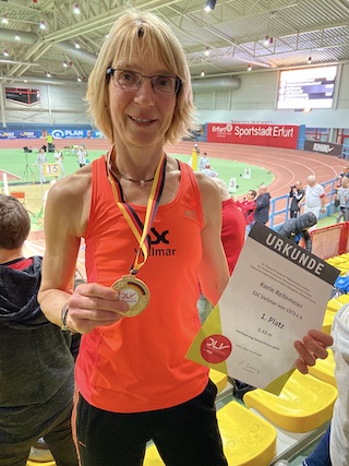 Karin war die erste SSC-Starterin am frühen Morgen. Nach kalter Dusche im Hotel ging es raus zur Hammerwurfanlage bei tlw. eisigem Wind. Karin erwischte einen tollen Wurf im 4. Durchgang mit einer Weite von 40.85m pB und sicherte sich damit die SILBER-Medaille hinter Margret Klein-Raber (LC Rehlingen), die 43.34m verbuchte. Bronze ging mit 31.46m an Ines Mikoleiczik (Sportfreunde Neukieritzsch). Das fing schon mal gut an.