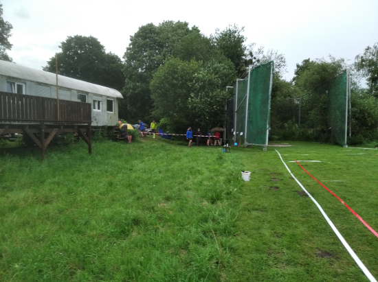Ein Hammerwettkampf musste mal sein, und bis vor zwei Wochen war es das einzige Hammerwurfangebot für die Risikogruppe Ü60. Hartmut warf an der Moosach hinter München den Hammer auf gute 50,62m. Dann kam der Regen und ein fernes Gewitter, der Ring wurde durch Grasschnitt stellenweise rutschig. Mit angezogener Handbremse gab es hier nochmal gute 38,46m im Diskus und nicht ganz zufrieden stellende 16,17 im Gewicht. Nur zwei gültige Versuche ist man von ihm nicht gewohnt. Aber eine sehr idylisch gelegene Anlage mit einer netten Wettkampf- und Veranstaltertruppe hat richtig Spaß gemacht.