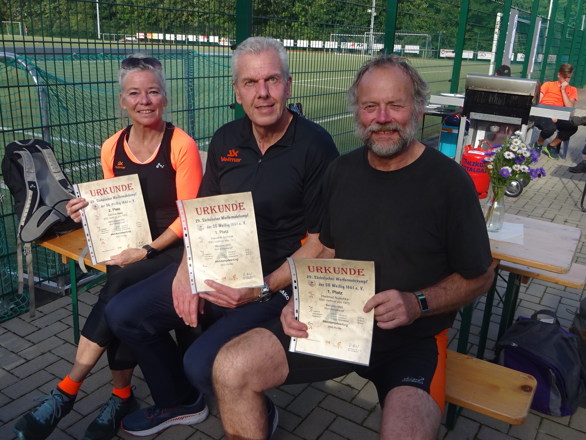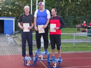 Knapp 400 km Richtung Osten zog es Sabine, Hendrik und Hartmut zum sächsischen Werfermehrkampf nach Freital/Weißig bei Dresden. Alle reisten schon Tag(e) vorher an um morgens um 9:30 Uhr ausgeruht die ersten Geräte in die Hand zu nehmen. Diese Mischung aus den Wurfgeräten der Leichtahtletik und einem typische Ost- (Keule) und westdeutschen (Schleuderball) Gerät war aus einer Anregung von El Creativo (Erwin Kollmar), dem Gründer von LSW Spezialsport, entstanden. Alle Teilnehmer kamen unverletzt bei super Wetter und guter Verköstigung gesund durch den Wettkampf. In drei Riegen mit jeweils 13 bis 20 Teilnehmern wurde geworfen so gut es ging. Dabei wurde bei den Langwürfgen gesteckt- andernfalls wäre der Zeitplan nicht zu realisieren gewesen.