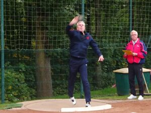 Nach sechs Disziplinen und erfolgter Siegerehrung des säschischen Werfermehrkampfes durfte frau/man dann auch mal auf der Bank Platz nehmen. Denn zum Abschluss gab es noch Gewichtwurf. Damit hatte, wer wollte, dann auch gleich eine Werferfünfkampf nach DLV-Regularien. Und die schöpferische Pause hat Sabine dann auch genutzt und mit dem Gewicht eine neue persönliche Bestleistung erzielt.