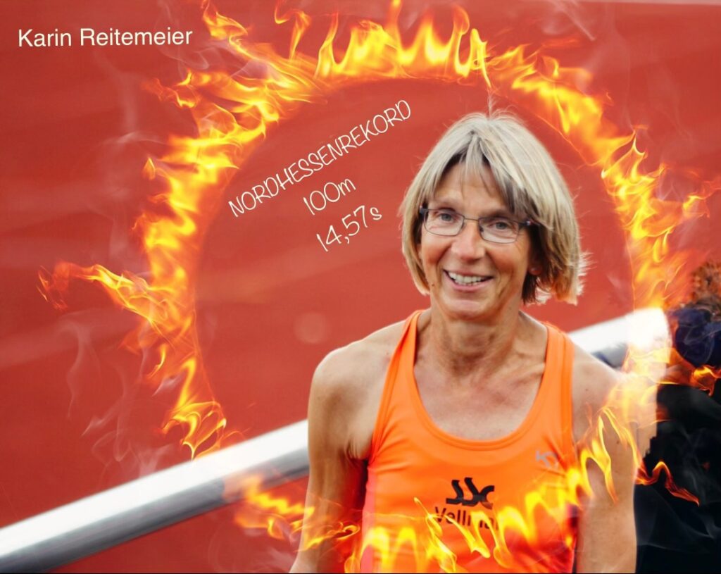 war in Superform. Gleich zu Beginn verbesserte sie den eigenen Nordhessenrekord im 100m-Lauf um 5/100 s auf 14.57s, und gleich danach kratzte sie beim Weitsprung ihren Hessenrekord mit 4,51m um wenige cm. Nicht genug, denn es folgten 1,32 m im Hochsprung und 9,84m mit der Kugel. 4 Top- Ergebnisse der Allroundathletin im 56.!!! Lebensjahr.