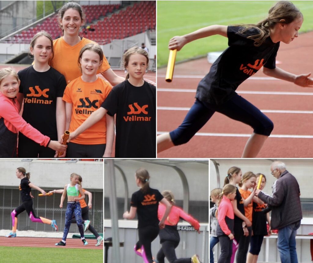 Zum erstenmal liefen die 4 Mädchen ein klassisches Staffelrennen, naturgemäß war die Nervosität groß. Im Training wurden kurzfristig mit Günter die Wechsel geübt, wobei eine wettkampfgerechte Anlage hilfreich gewesen wäre. Beim üben war Leonie dabei, verletzte sich jedoch und konnte im Auestadion nicht dabei sein. Also musste Marie ran und war als Startläuferin eingeplant. Dann jedoch die Angst vor dem lauten Startschuss. Somit kam die Formation Thea-Carlotta-Lina-Marie zustande. Die Mädchen wurden mit 32,87s Vizemeisterinnen, strahlende Gesichter danach. Die Bilder zeigen die Staffel in der Laufaufstellung v. rechts mit der Trainerin Carolin Klupsch, Thea als Startläuferin, den 2. Wechsel von Carlotta auf Lina, den letzten Wechsel zwischen Lina und Marie (kurz vor dem Ziel😀) und Günter mit der Staffel bei der Vorbereitung zum Foto. Bild oben unser Trainer + Organisator Bernd Fröhlich mit der Staffel.