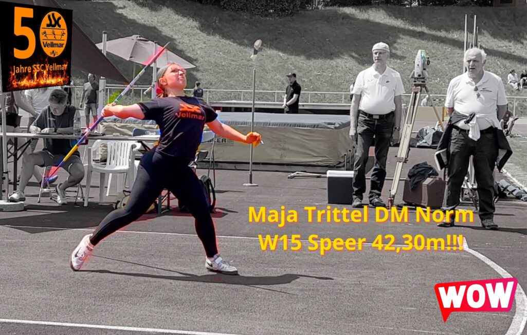 Beim Pfingstsportfest in Baunatal präsentierte sich Maja in prächtiger Verfassung. Mit 42,30m übertraf sie nicht nur erstmals die 40m, sondern überbot die DM-Norm um 2,30m. In Deutschland ist das in diesem Jahr die bisher beste Leistung. (1 Tag später am 28.05.23 warf eine W15erin weiter)