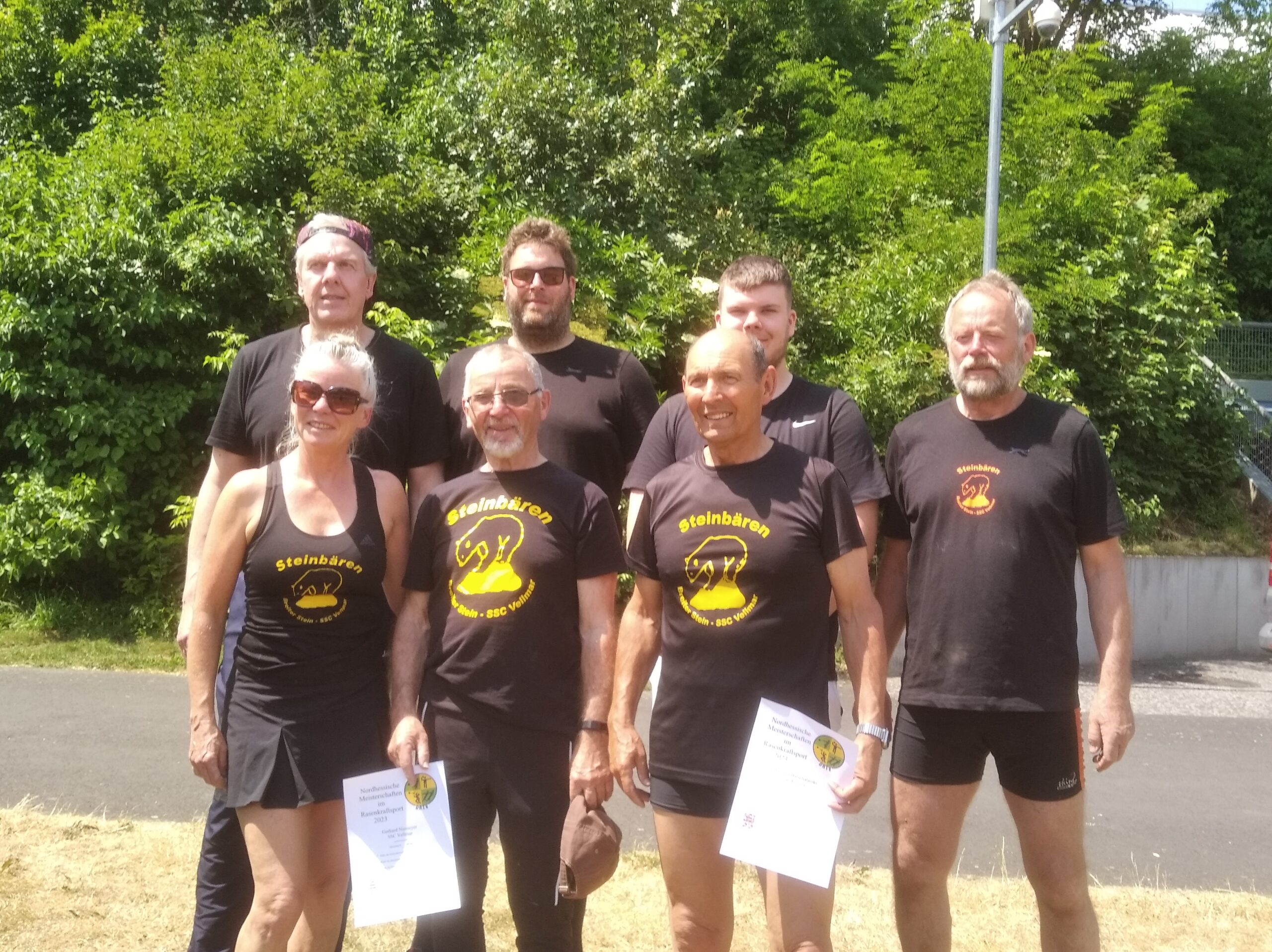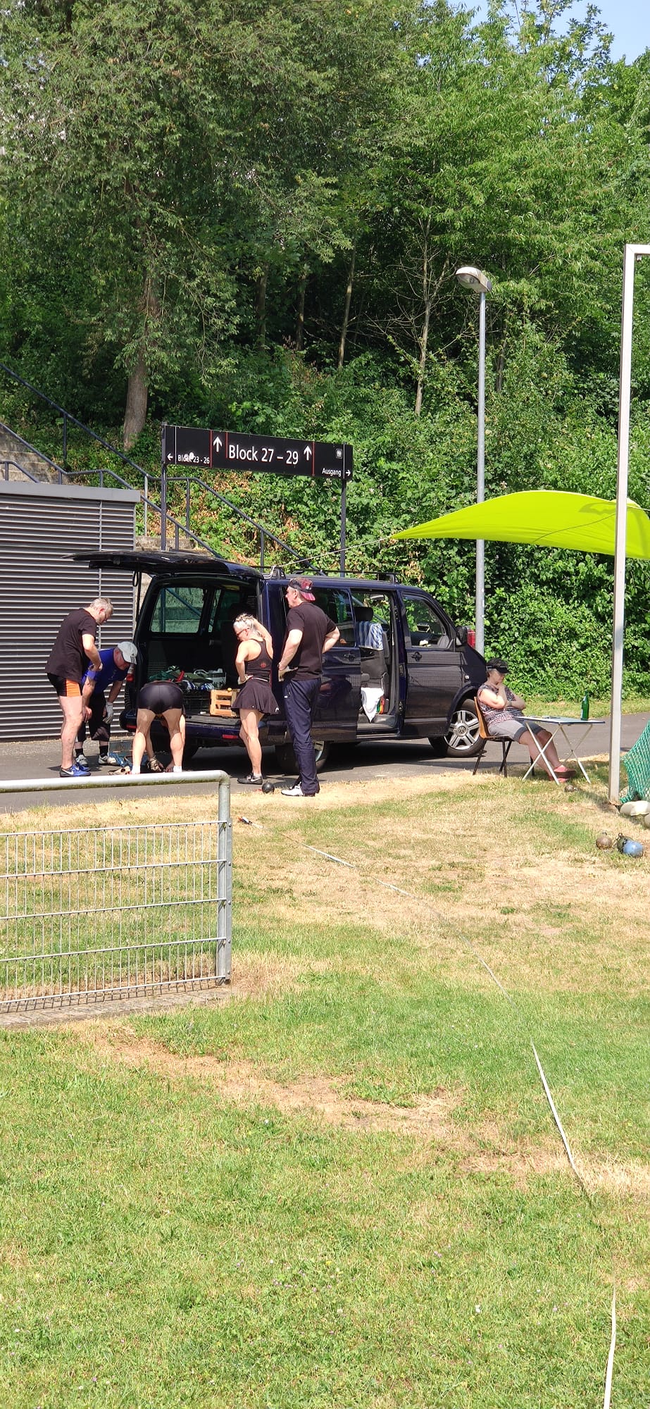 Es ging wahrlich heiß her in den Wurfringen und der Steinstoßanlage. Der am weitesten angereiste Thomas mit Familie gab sein Bestes und war mit den Drehwürfen auch zufrieden, nur mit dem Stein haderte er etwas. Er setzte sich aber damit trotzdem an die Spitze in Deutschland. Hendrik kommt so langsam gut in Schwung und dürfte mit dem Gewichtwurf persönliche Bestleistung erzielt haben. Sabine ist mit ihrem Dreikampfergebnis sehr zufrieden und rangiert damit aktuell auf Bundesebene an zweiter Stelle. Leider hat sie das Gewicht nicht wie im Einwerfen getroffen. Auch Basilius hat das am heutigen Tag erreicht, nur 10 Punkte fehlen ihm zur Spitze. Den Platz eins der deutschen Bestenliste stellte Gerhard einmal mehr unter Beweis. Hartmut hadert weiter mit seinen Wehwehchen um auch mal wieder vorn zu sein, aber war unter den persönlichen Randbedingungen zufrieden. Hier die Ergebnisse des Dreikampfs und des anschließenden Hammerwurfturniers.