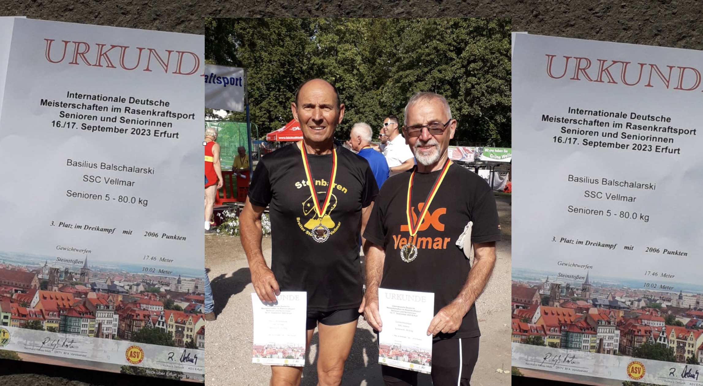Bei den Deutschen Rasenkraftsport-Meisterschaften in Erfurt. In der Altersklasse Senioren 6 (ab 80 Jahre) – 80kg erkämpfte er 3 Goldmedaillen. Er sicherte sich neben dem Titel im Dreikampf (Hammer 27,16m – Gewichtwurf 16.54m – Steinstoßen 9,47m) mit 1874 Punkten auch noch den obersten Podestplatz mit dem Stein und Gewicht. Meisterschaftsdisziplinen waren ausgeschrieben im Dreikampf, dem Gewichtwerfen und Steinstoßen, während der Hammerwurf (da war er auch Bester) lediglich Bestandteil des Dreikampfes war.