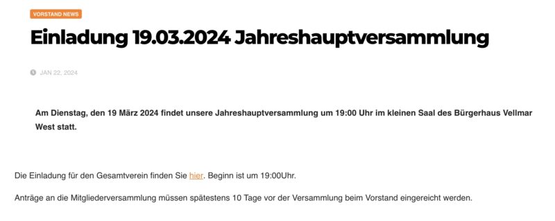 Am Dienstag, den 19 März 2024 findet unsere Jahreshauptversammlung um 19:00 Uhr im kleinen Saal des Bürgerhaus Vellmar West statt.