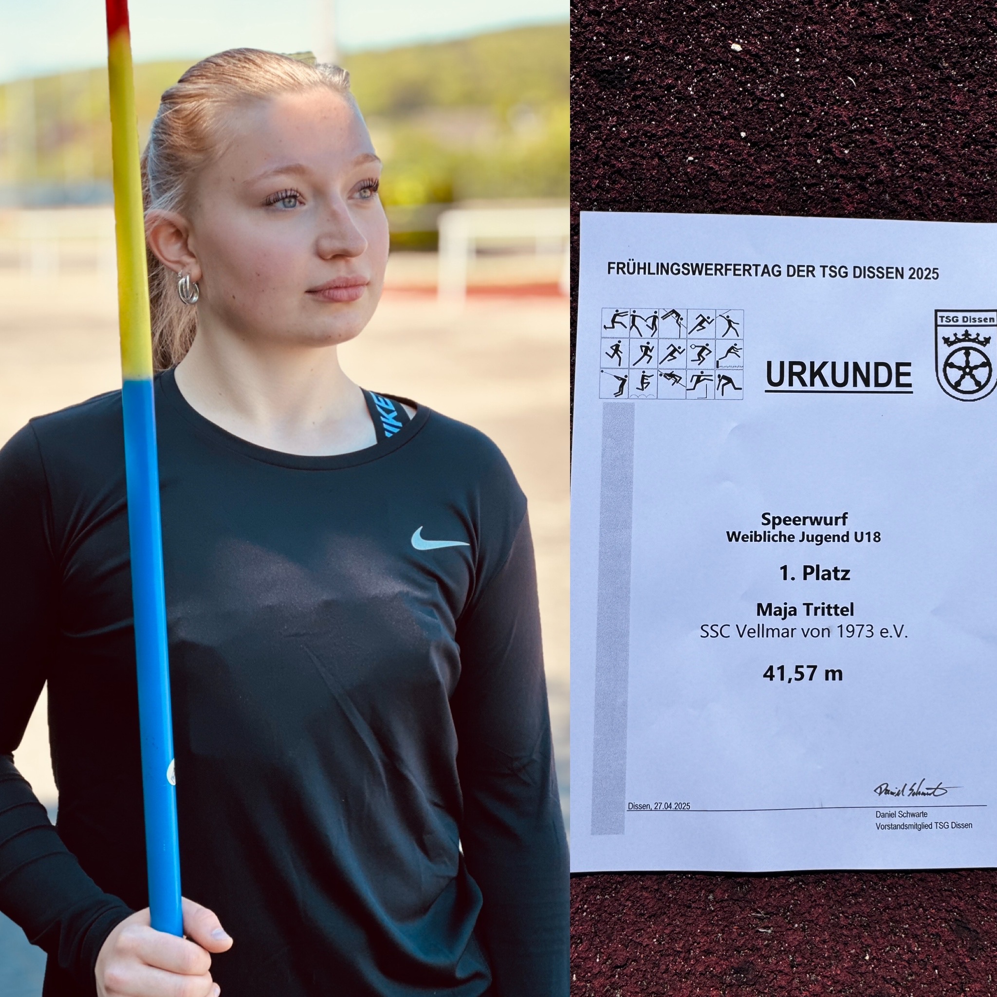 Den 500g Speer warf sie in Dissen (Teuteburger Wald) als Siegerin 41,57m weit – ein Ergebnis, das in Anbetracht der kurzen Rehabilitationszeit verblüfft. Nur 2,43m fehlen zur DM Norm (44.00m).